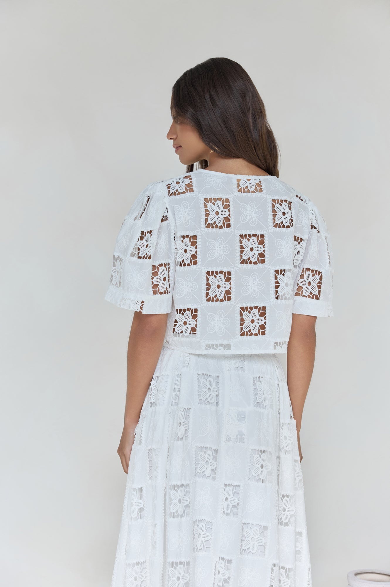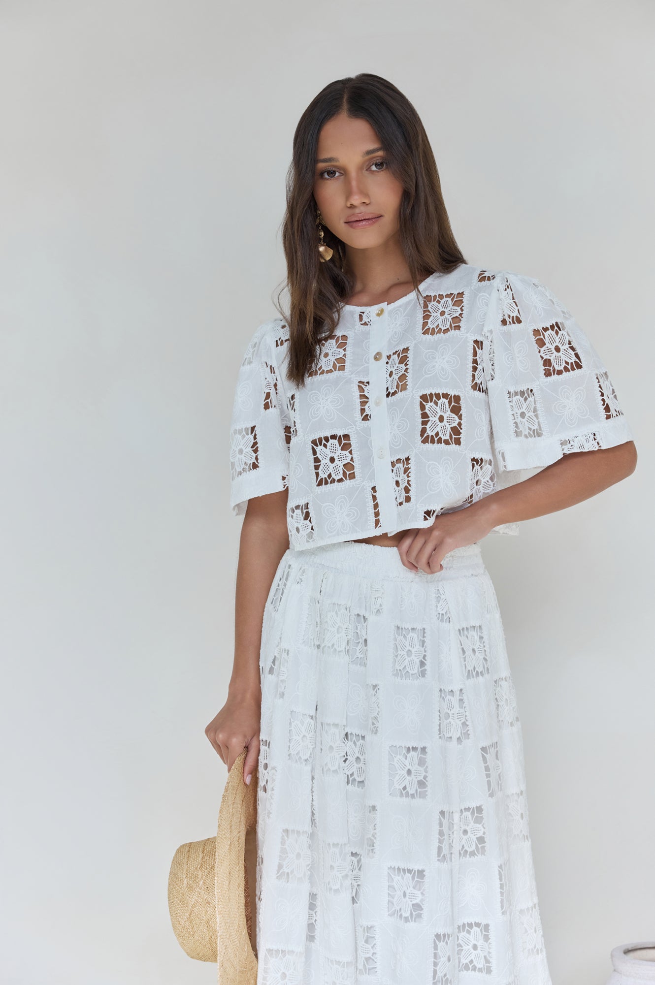 Embrace your inner boho babe with the Andolina Crochet Lace Crop Top. Featuring a gorgeous checkerboard floral lace pattern, this piece brings vintage charm to life. The round neckline and short sleeves keep it light and airy, while the button front closure adds just the right amount of detail. Perfect for pairing with anything from flowy skirts to high-waisted shorts, this top is your new go-to for effortless style.