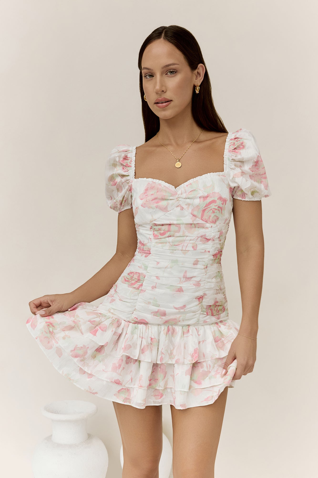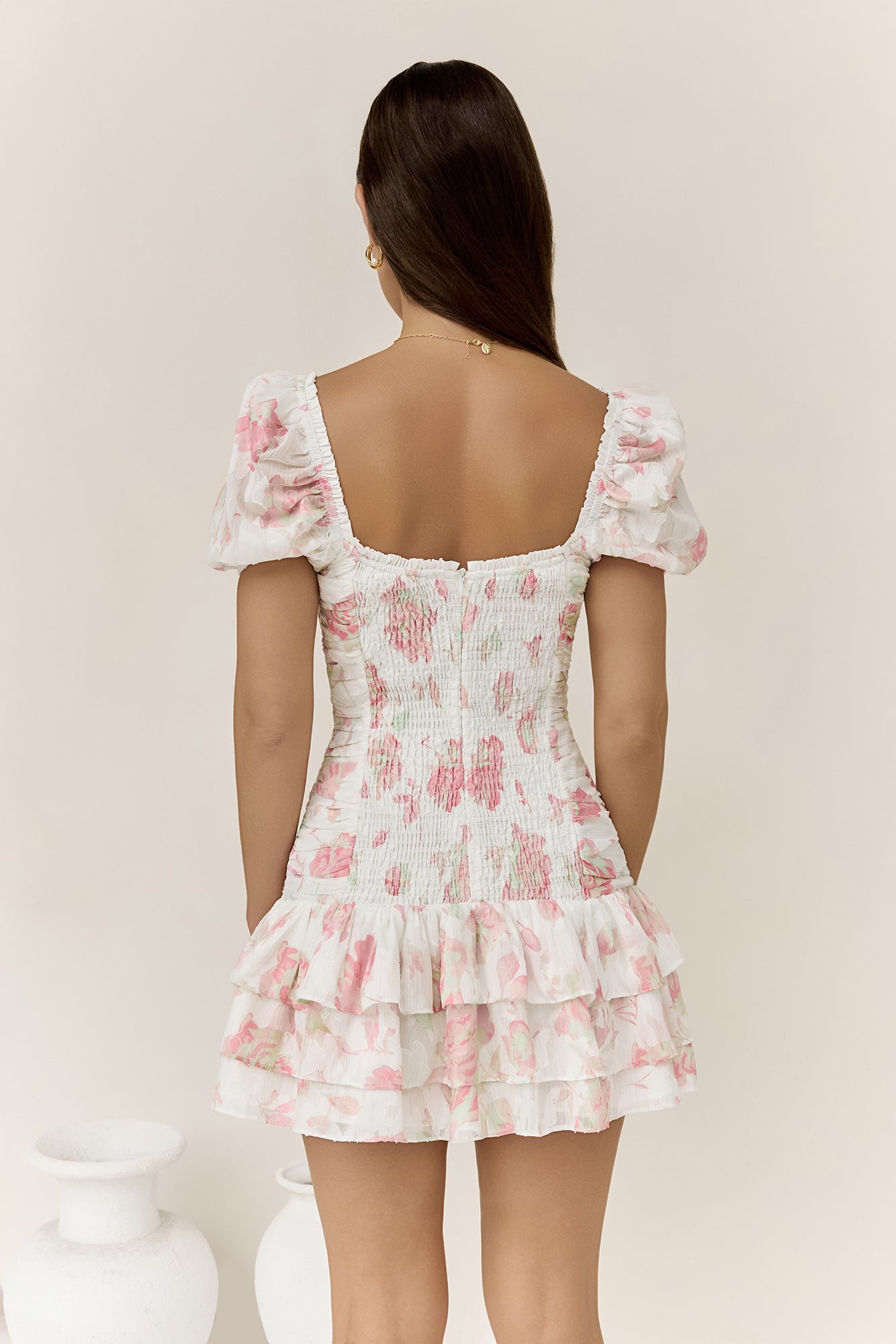 Step into a romantic moment with the Flora’s Dream Mini Dress by Hello Molly, featuring a delicate frill neckline, dreamy elastic puff sleeves, a flattering gathered bodice, a tiered frill skirt, and a subtle silver pinstripe for a hint of shimmer! Style with kitten heels and gold adornments for your next spring event.