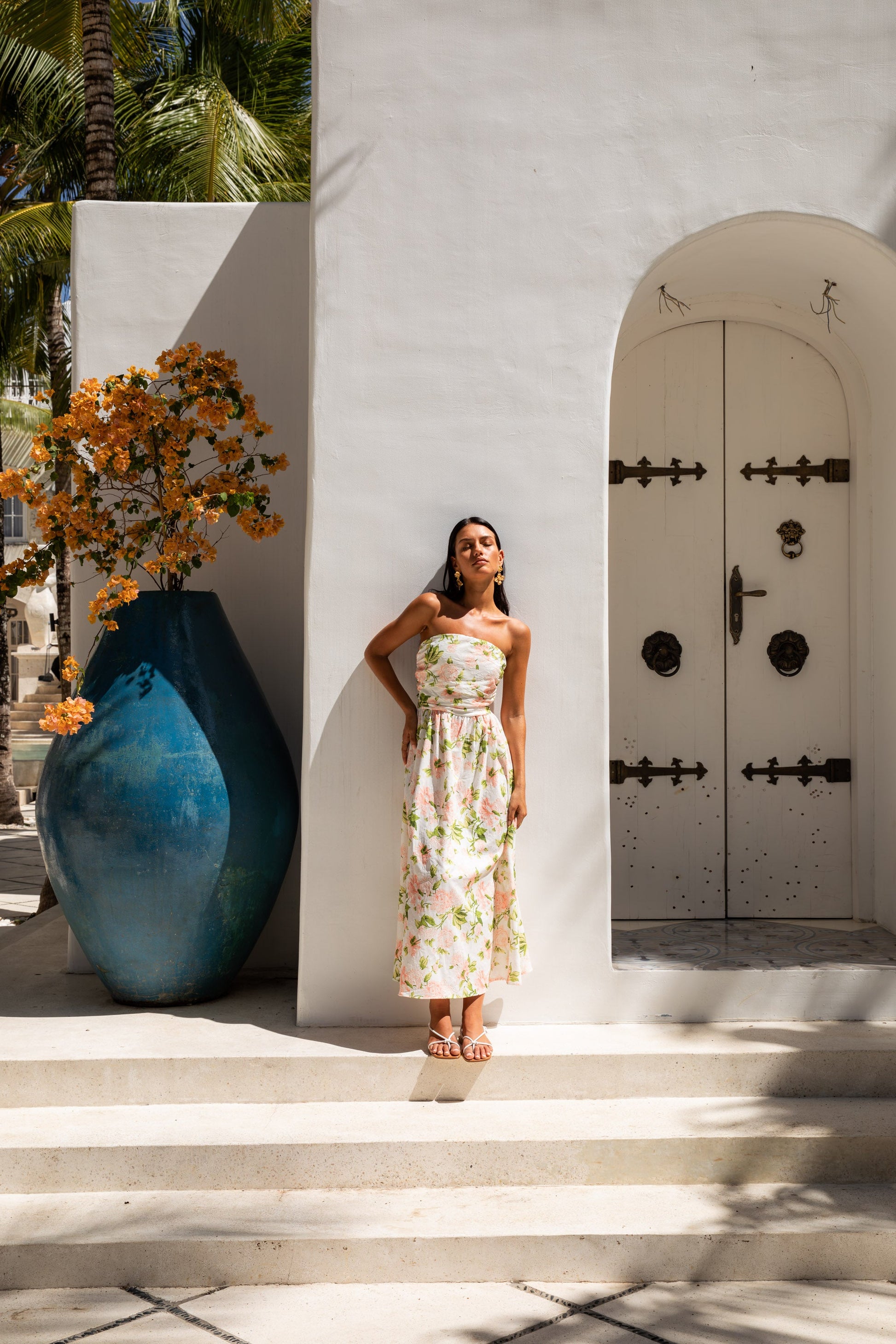 Make a statement with our Exclusively Designed, FORTUNATE ONE Bellissima Strapless Maxi Dress in Pink. This elegant, strapless dress features a flowing silhouette and vibrant hues, perfect for adding a touch of glamour to your summer soirées.