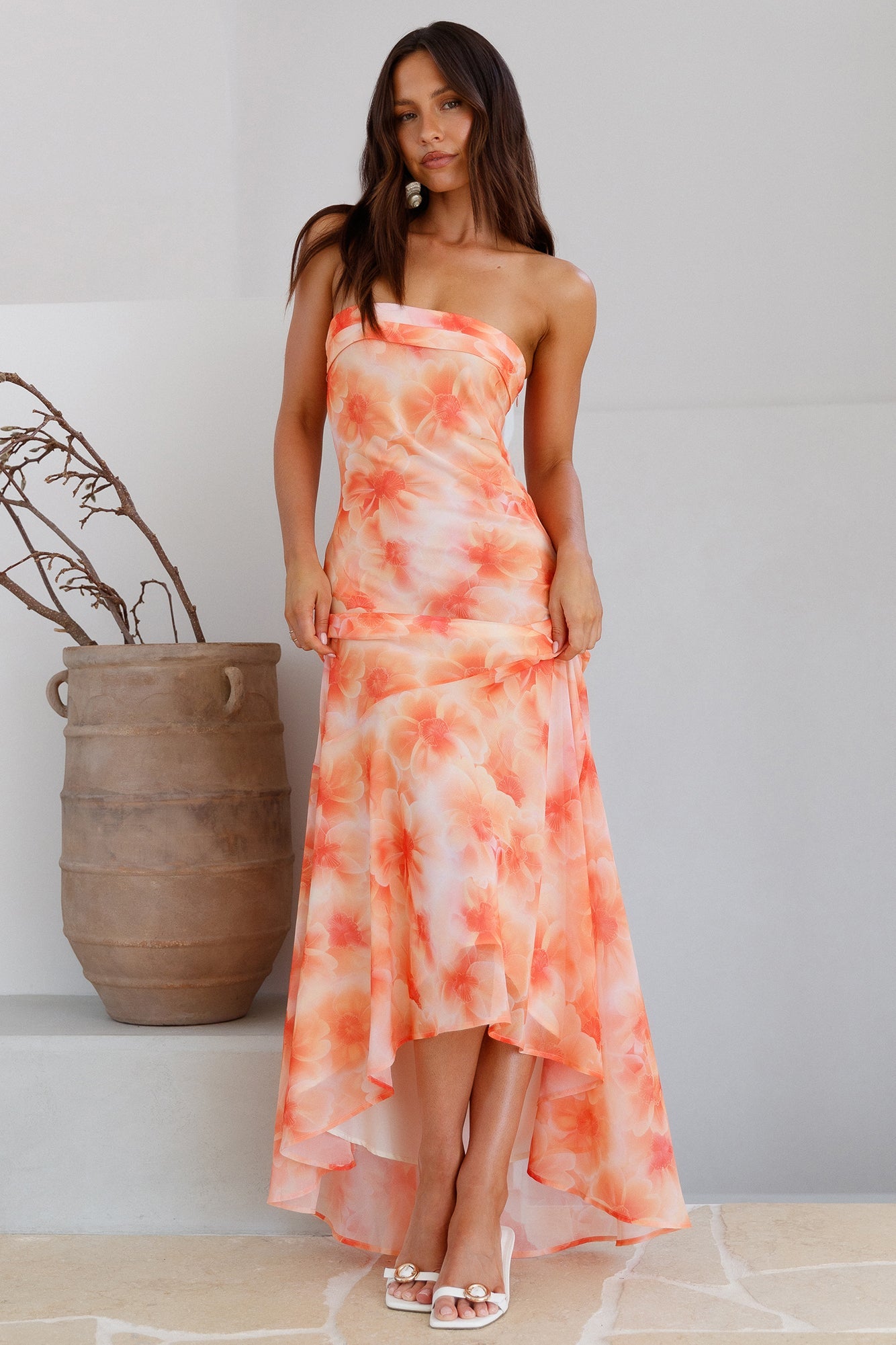 Capture the warmth of summer sunsets with the Golden Hour Glow Strapless Maxi Dress. Designed to make you shine, this vibrant orange dress features a flattering strapless silhouette.
