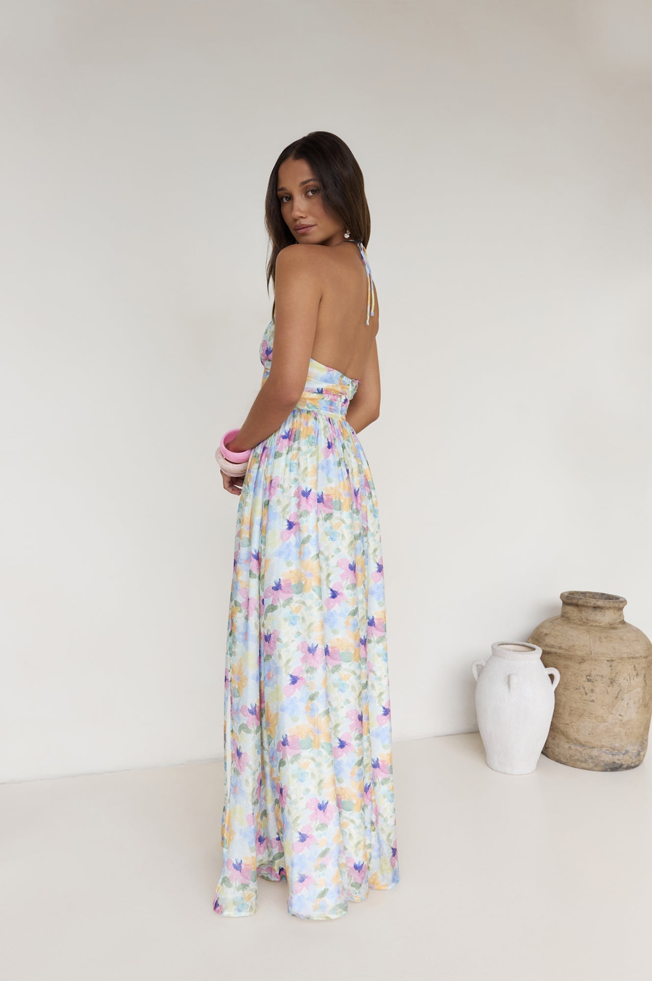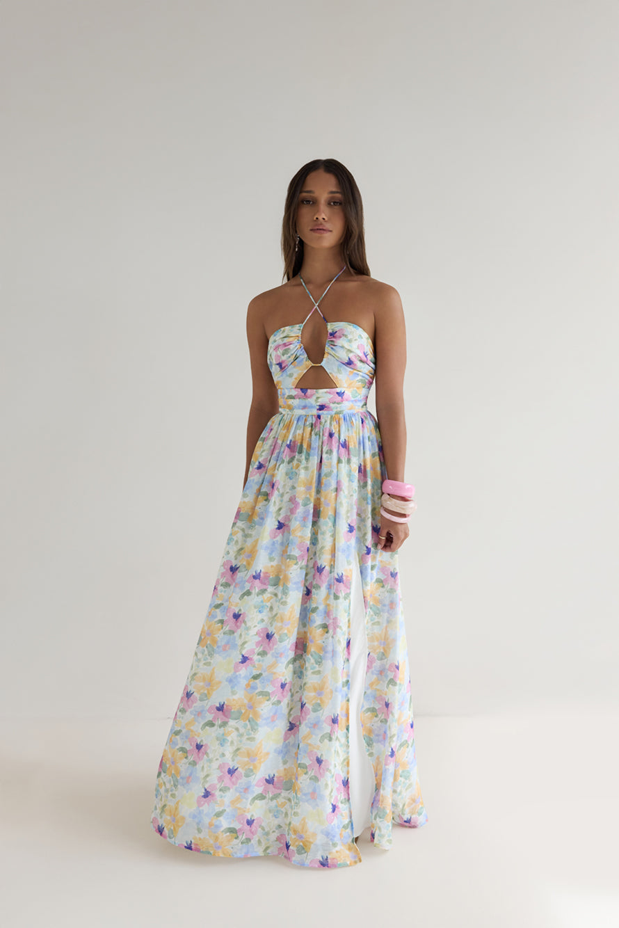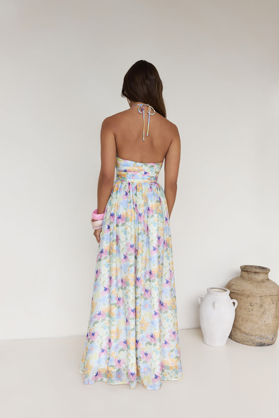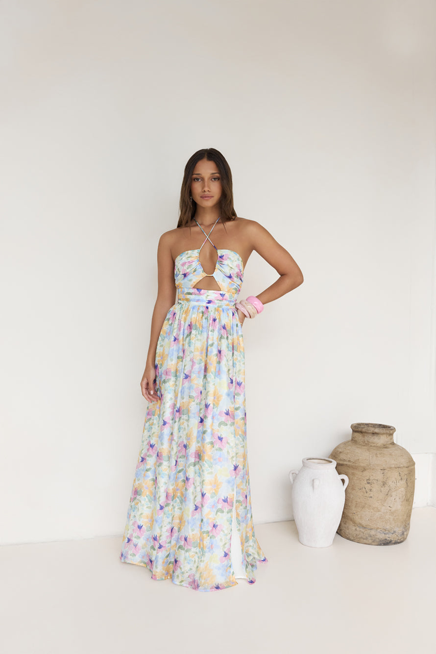Embrace the charm of the Hibiscus Hues Halter Maxi Dress, featuring a halter tie, cutout to the bodice, and a flowy skirt with a split that adds a touch of allure to this stunning print design. Style with heels.