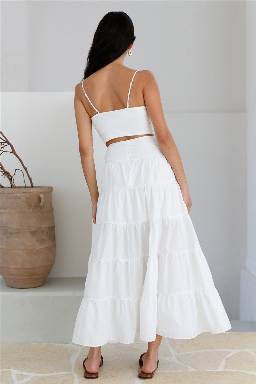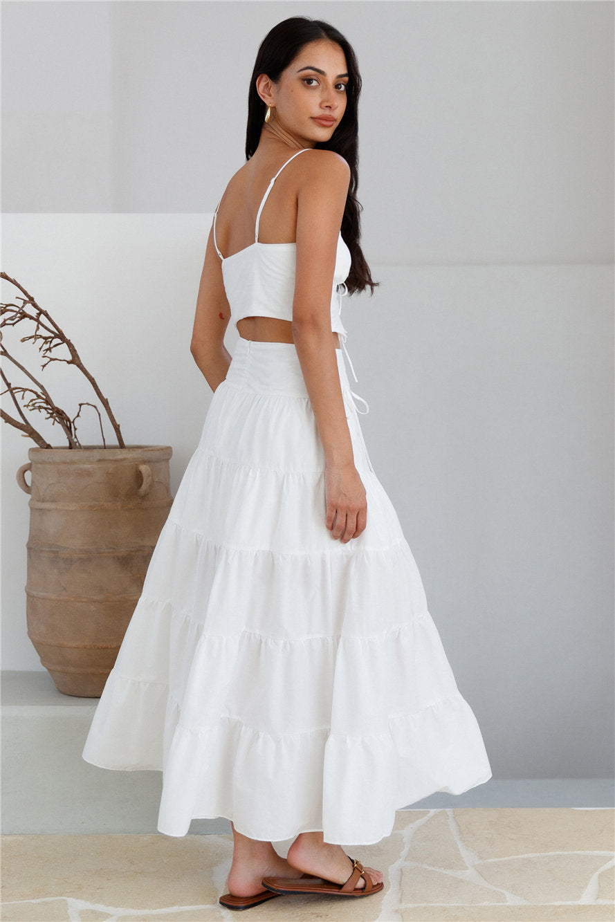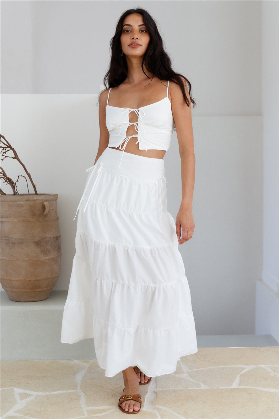 Embrace sun-kissed moments in our dreamy Honeydew Haze Set. This ethereal two-piece features a flirty crop top with delicate tie details and a show-stopping tiered maxi skirt. The crop top's adjustable straps and feminine lace-up front offer the perfect blend of comfort and allure, while the skirt's flowing tiers create magical movement with every step.