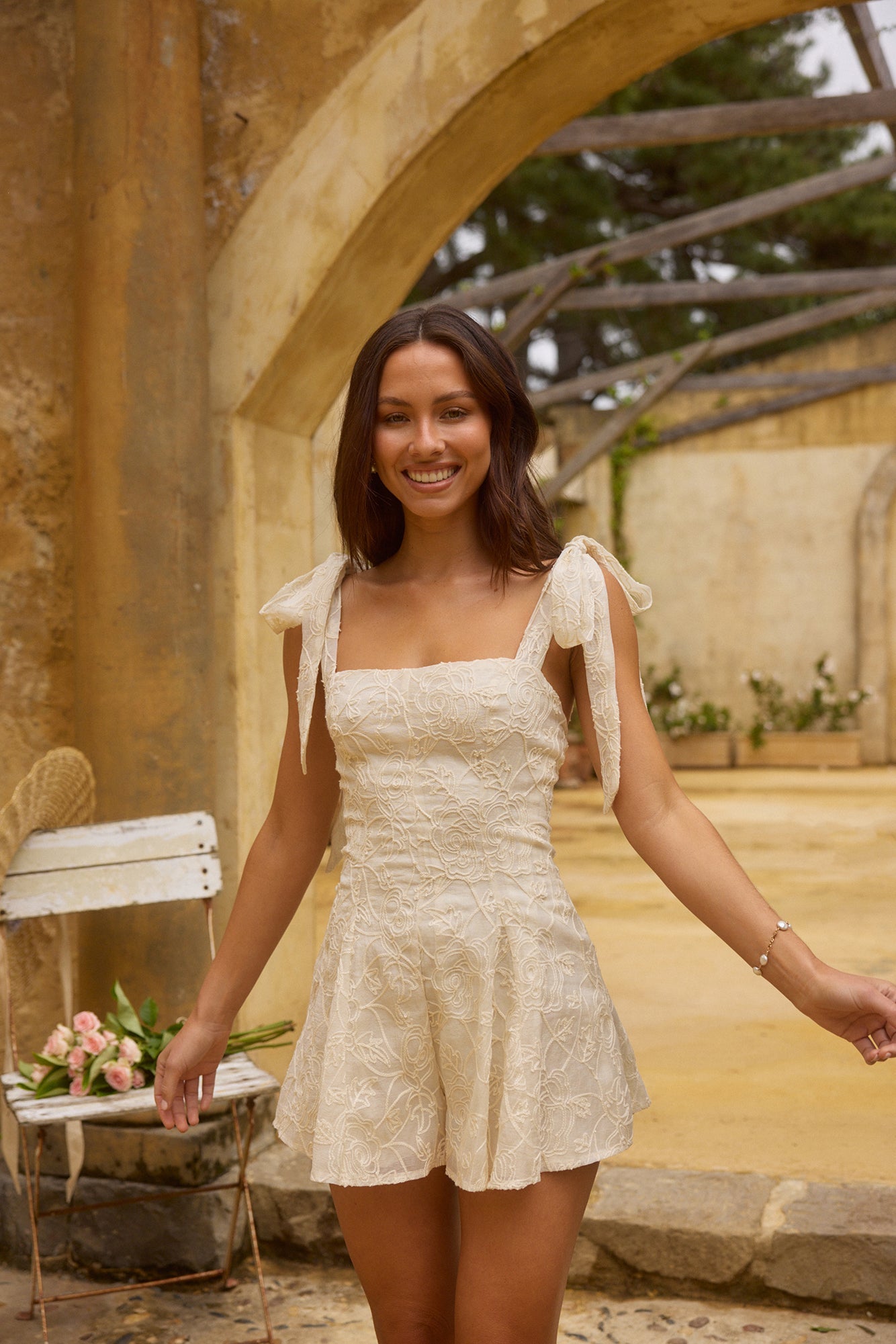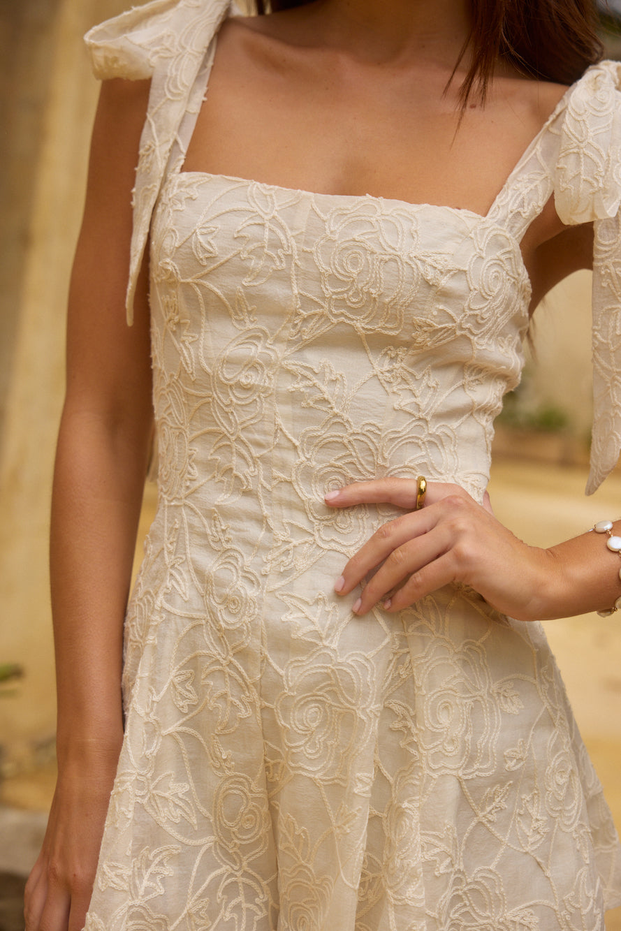 The Kinds of Kyra Playsuit in White is a stunning piece featuring delicate lace embroidery throughout. This versatile mini dress is perfect for dressing up or down for any occasion. The thick tie-up straps on each shoulder add a charming detail, enhancing its overall appeal. Whether you're heading to a brunch with friends or a night out, this gorgeous piece is sure to make a statement.