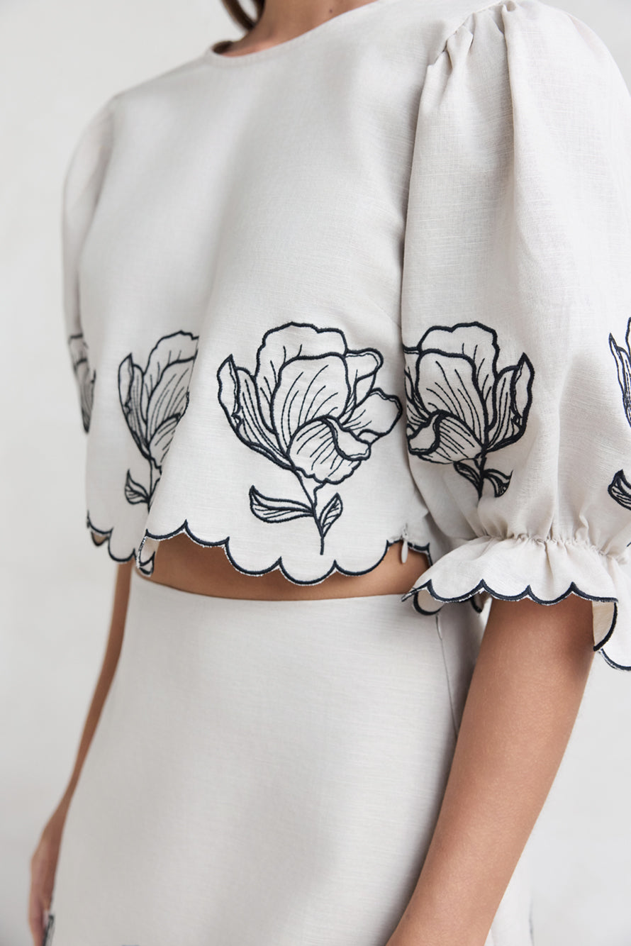 Breezy, romantic, and effortlessly feminine, this two-piece set is a warm-weather dream. The Lovers In Lanai Set is designed from delicate embroidered fabric and features a short-sleeved top with elastic and a high-waisted skirt.