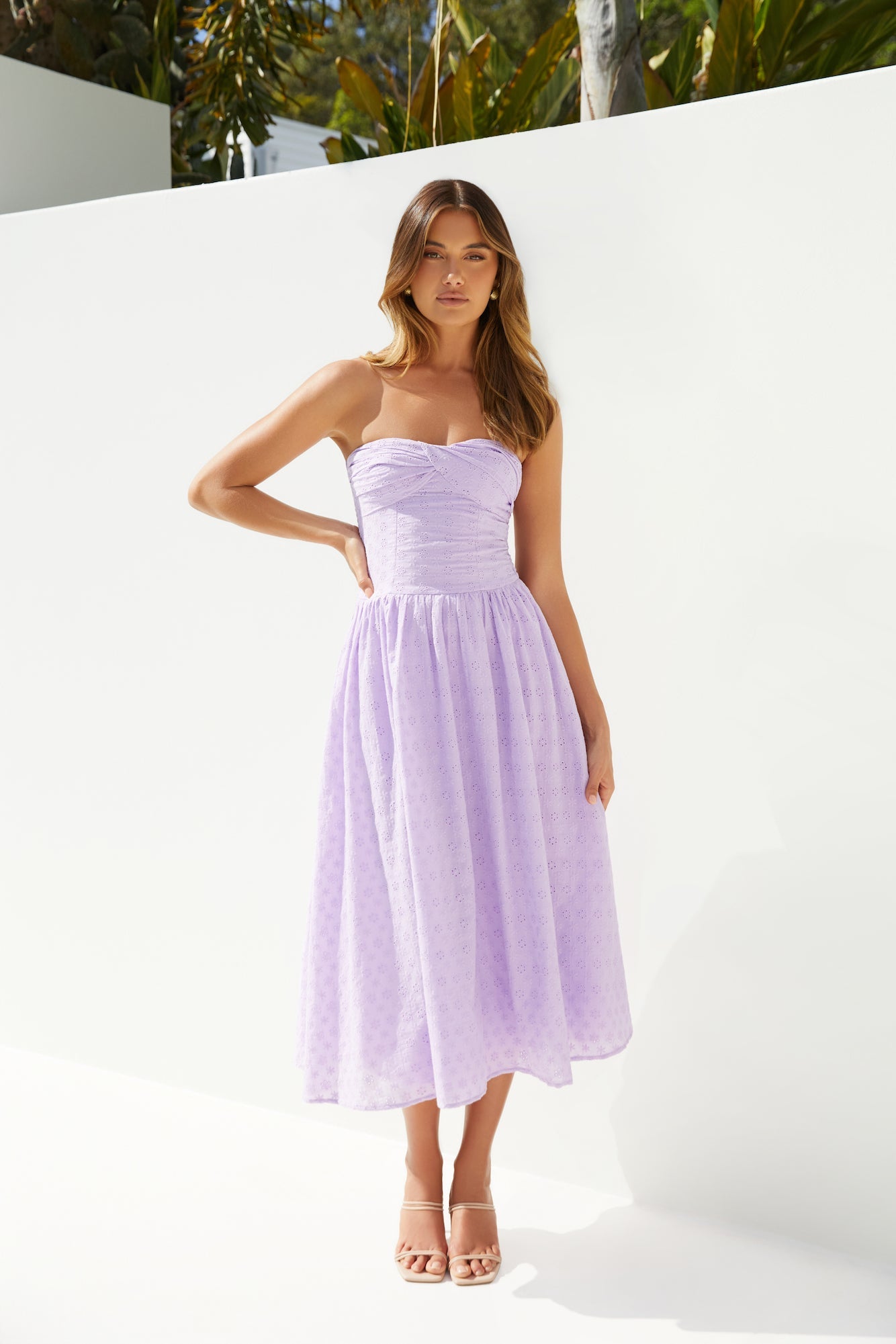 Feel like royalty in our Mimi Moments Strapless Maxi Dress in Purple. Designed to make every moment magical, this stunning dress features delicate eyelet detailing throughout, adding a touch of romance and elegance. The tulle underlay creates a voluminous silhouette, giving you that princess-like feel with every step.