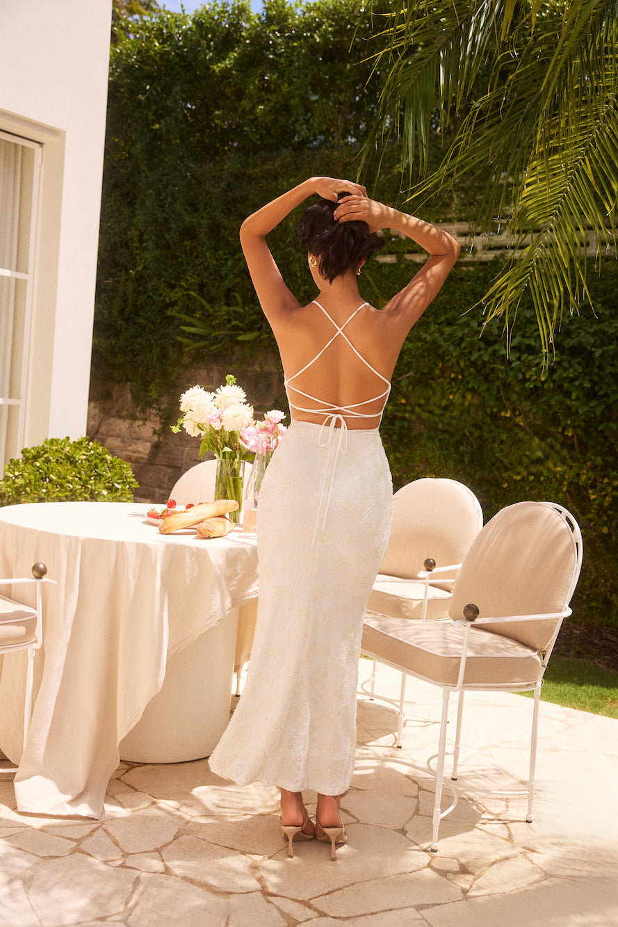 Turn heads in the Next to me Midi Dress in Cream. This sultry silhouette features a deep plunging neckline, halter tie straps, and ruched detailing at the bust for a flattering fit. Designed with an intricate floral lace overlay in warm golden hues, this dress exudes timeless elegance with a modern twist.