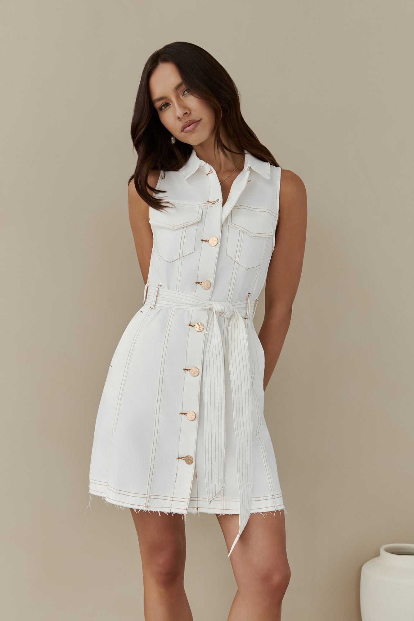 For the girl who’s always chasing the next destination. The Off Duty Explorer is your go-to mini for laid-back adventures and long weekends away. Made from soft stretch denim, it features a crisp collar, button-down front, and contrast stitching for that utility-inspired edge. The waist tie lets you define your shape, while front pockets bring function to the fashion. Unlined and easy to move in, this piece is made for road trips, rooftop sunsets, and everything in between.
