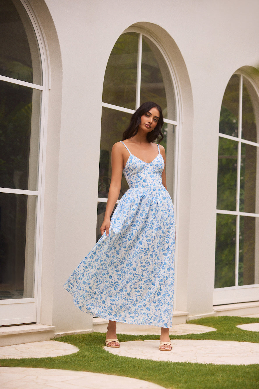 The Painted Skies Maxi Dress in Blue is a vision of elegance and charm, featuring a crisp white base adorned with delicate blue floral patterns. This flowing maxi dress has a flattering V-neckline and a playful back bow detail, adding a touch of romance to its timeless design. Perfect for any occasion, this dress can be styled up with heels and bold jewelry for a sophisticated look or dressed down with sandals and a sunhat for an effortless, breezy vibe. Whether at a garden party or a casual brunch, this dress is sure to make a graceful statement.