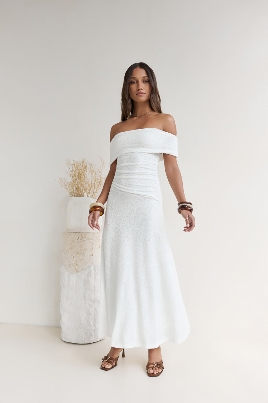 Secret Shorelines Off Shoulder Maxi Dress White