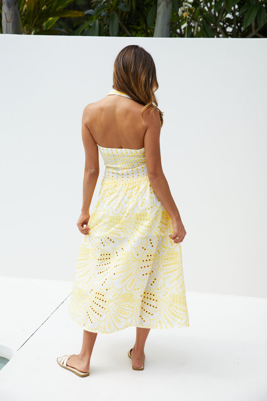 Bask in the glow of sunshine with the radiant Sunlit Shores Maxi Dress. Featuring a chic square neckline with a delicate neck strap, this dress effortlessly combines style and comfort. The elastic center design adds a flattering touch, while the intricate eyelet detailing throughout exudes a timeless charm.